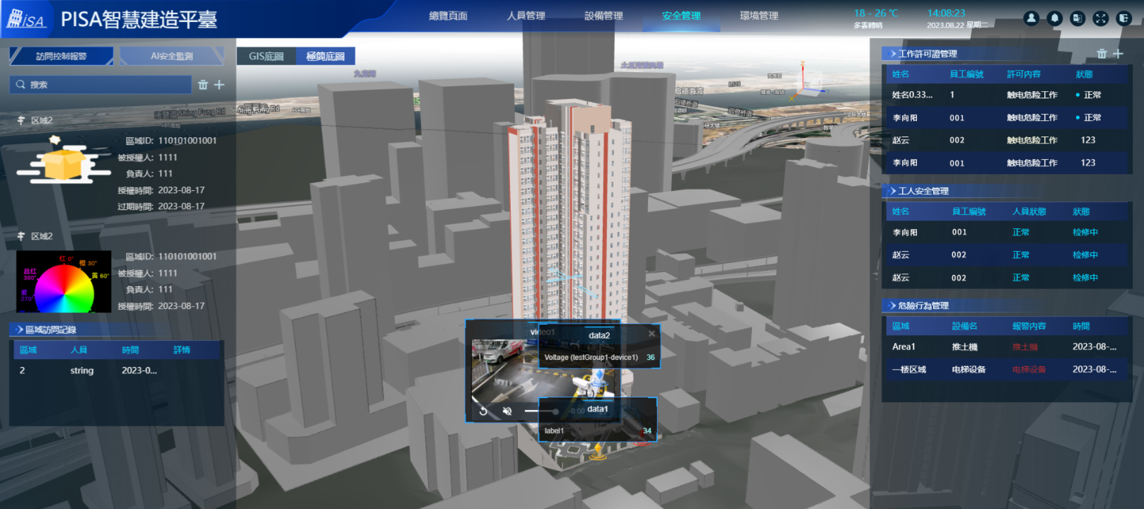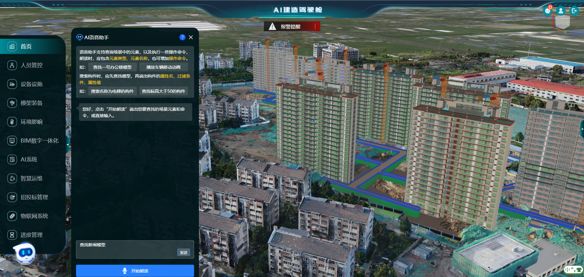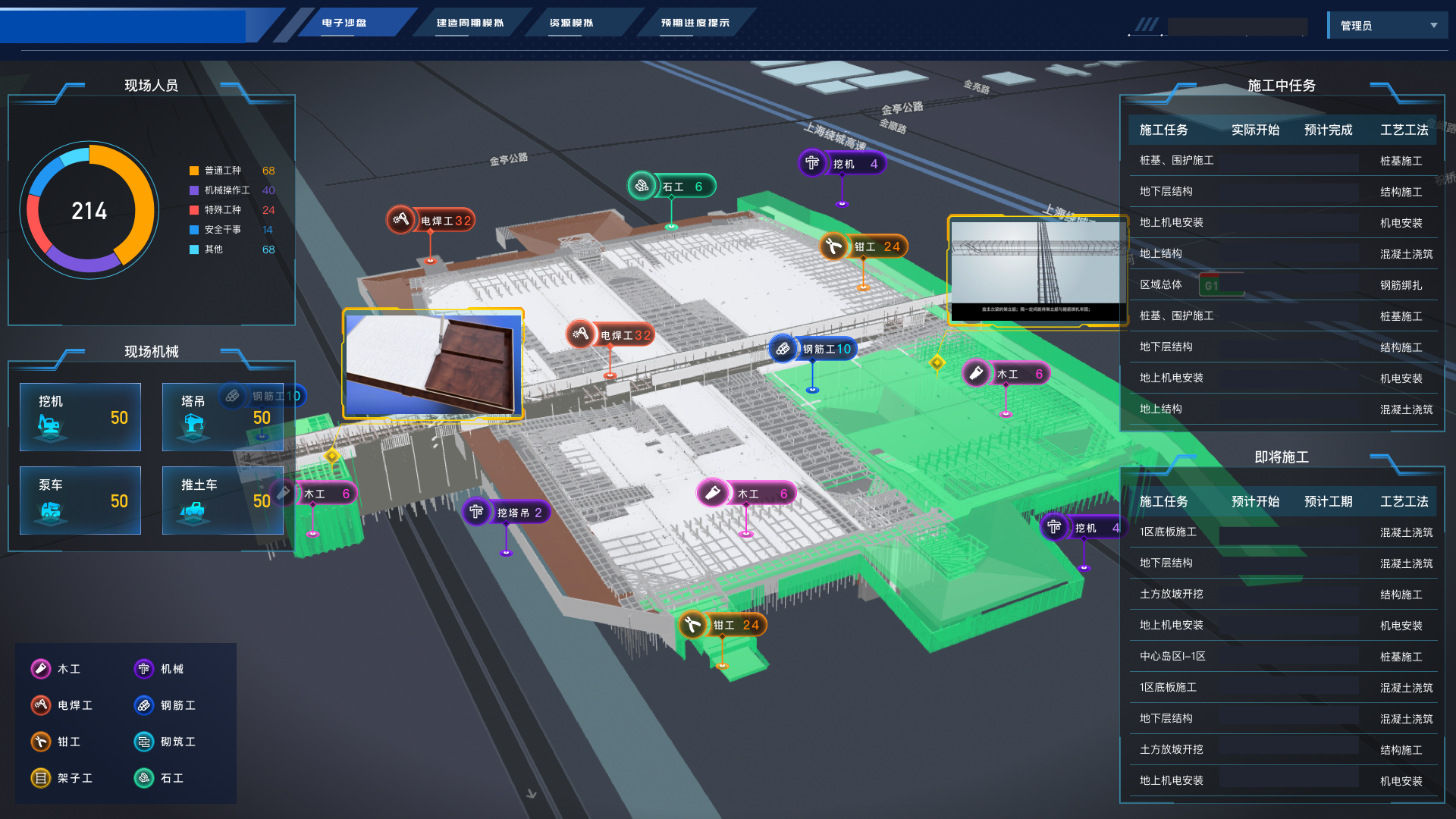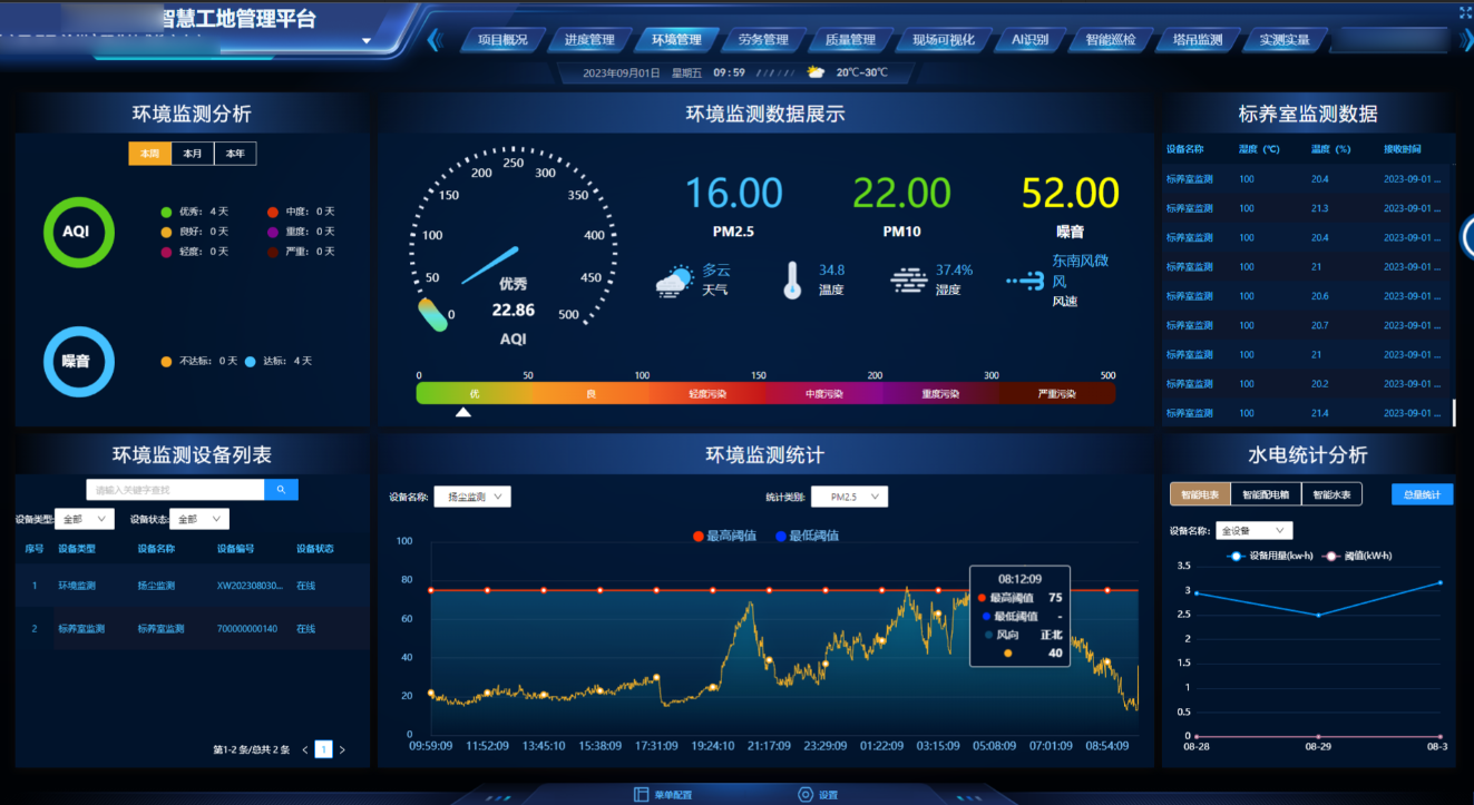 该智慧建造平台以工程BIM模型为基础,结合底图、建筑白模等元素对项目现场和周边环境进行可视化呈现,通过平台所具备的物联网协议和自定义数据接入能力,将项目重点关注的人员、设备、环境监测数据快速接入,并通过各种预置的部件库和标签系统进行可视化呈现,业务覆盖了项目现场人员管理、设备管理、安全管理、环境管理以及协同业务的管控。