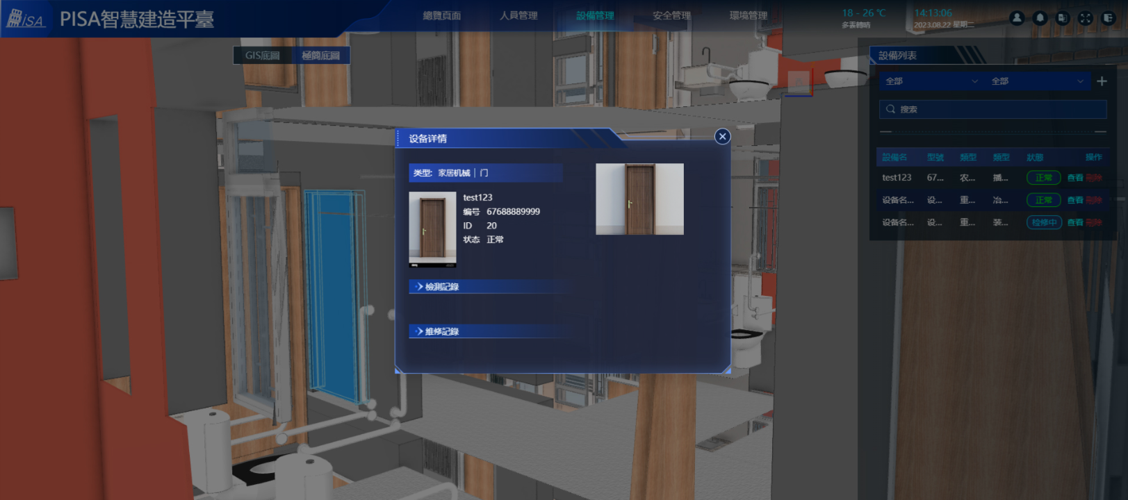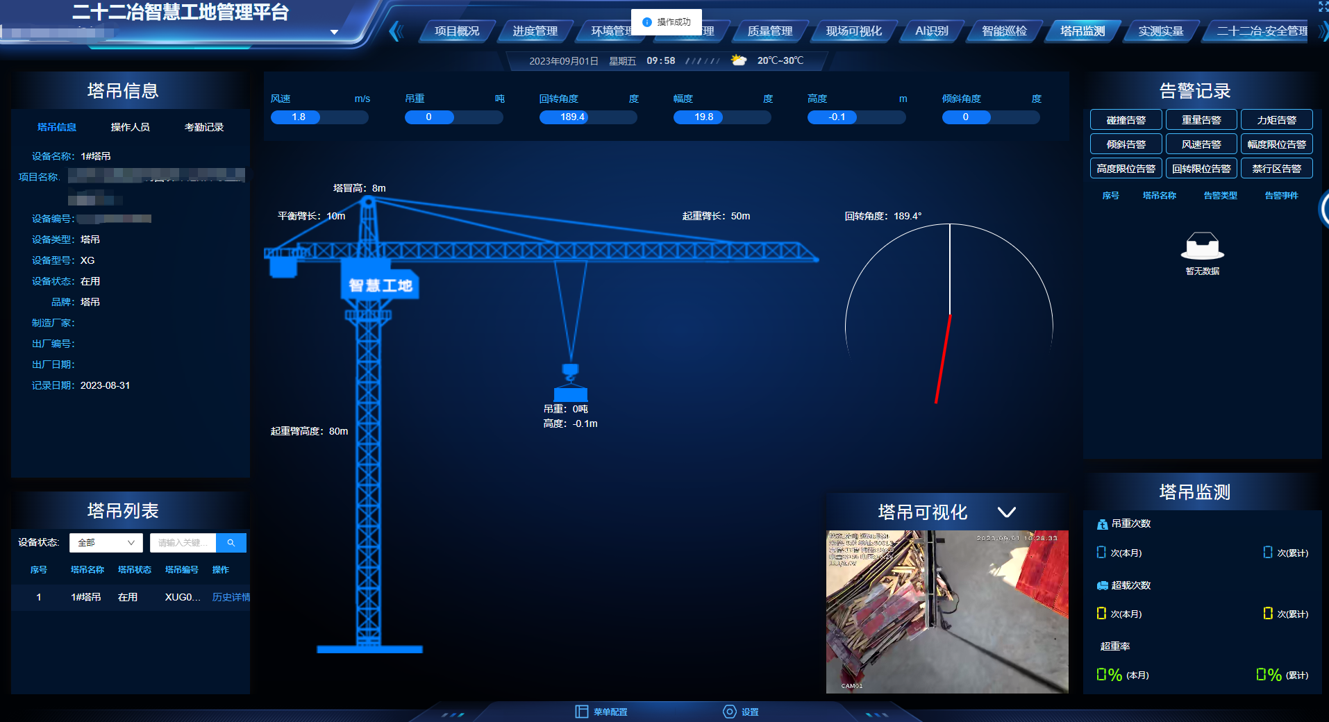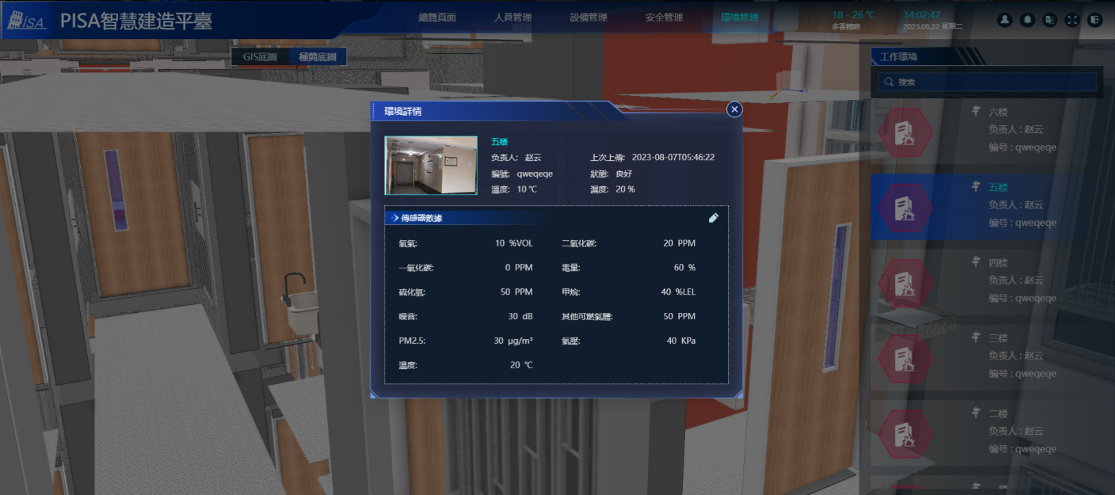 该智慧建造平台以工程BIM模型为基础,结合底图、建筑白模等元素对项目现场和周边环境进行可视化呈现,通过平台所具备的物联网协议和自定义数据接入能力,将项目重点关注的人员、设备、环境监测数据快速接入,并通过各种预置的部件库和标签系统进行可视化呈现,业务覆盖了项目现场人员管理、设备管理、安全管理、环境管理以及协同业务的管控。