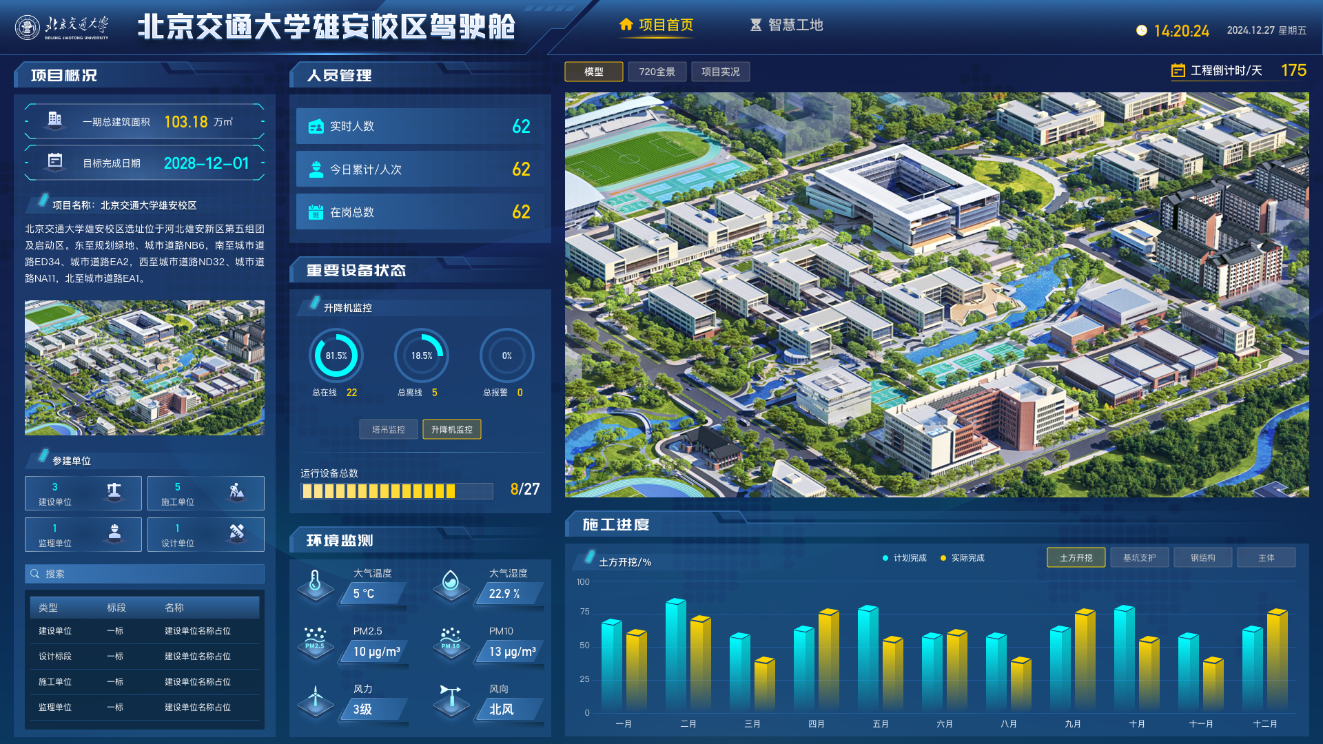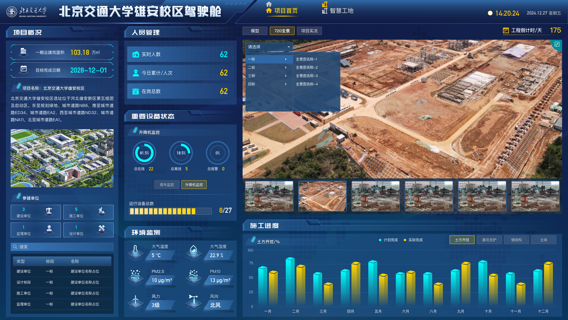 平台通过精确的人员管理和环境监测,确保了施工现场的安全和工程质量。其中安全管理模块,可以帮助业主及时发现并处理安全问题,保障项目建设的如期进行;施工进度跟踪功能,能够确保工程项目按计划推进以及随时调整施工策略;平台也为师生提供了一个实践平台,学生可以通过参与驾驶舱的管理和维护,了解行业最新的智慧管理平台和项目管理知识,在科研方面,平台收集的大量数据也为学校在相关领域的研究提供了丰富素材。
